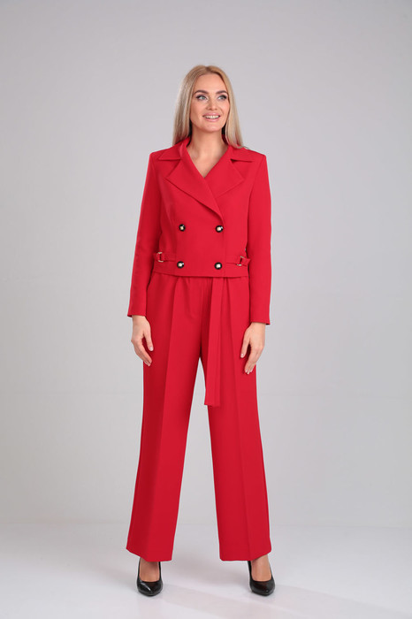 Комплект 2-х предметный. Жакет укороченный прямого силуэта, на подкладке. Двухбортная застежка на петли-пуговицы. Декоративный элемент на полукольцах паты. Рукав втачной, полной длины. Брюки широкие, со стрелками. Верхний срез на широкой резинке со шлевками для съемного пояса (входит в комплект).