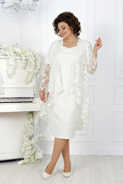 Платье женское полуприлегающего силуэта, длиной по среднему шву спинки р 52,54,56,58,60 - 104 см; р.62,64,66 - 105,5 см. Перед с рельефными швами, проходящими через центр груди, идущими от пройм до низа. Центральная часть переда в области горловины с фигурными подрезами, декорированы кружевом и стразами. Спинка с рельефными швами, идущими от пройм до низа, со средним швом, в верхней части которого расположена застежка на потайную тесьму-"молнию", в нижней – шлица. Горловина спинки округлой формы, переда – фигурное каре, декорирована стразами. Рукав втачной, одношовный, длиной 27 см.