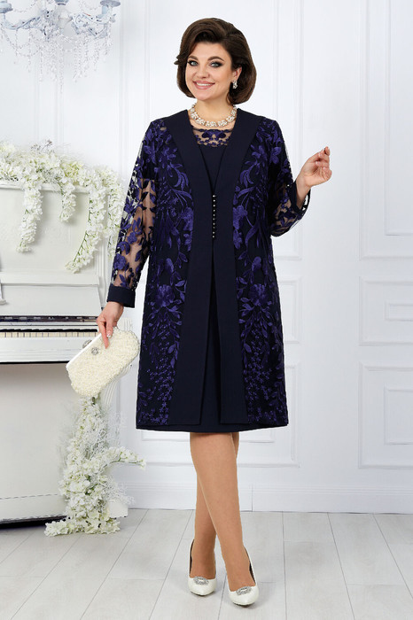 Платье женское полуприлегающего силуэта, расширенное к низу, длиной по среднему шву спинки 103 см. Перед с фигурной кокеткой из гипюра, идущей от середины левого плеча и уходящей в правую пройму, с декоративной деталью по правой стороне, идущей от кокетки вниз до линии талии. Декоративная деталь 2-х слойная: верхний слой из гипюра, нижний из трикотажной подкладки. Перед с нагрудными вытачками, идущими: левая- из проймы, правая от декоративной детали. Спинка с талиевыми вытачками, со средним швом, в верхней части которого обработана застежка на потайную тесьму-«молния». Горловина спинки округлая, обтачная. Горловина переда округлая, углубленная, срез обработан на плоскошовной машине. Рукава втачные, одношовные. Длина рукавов 21 см.