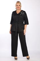 Длина жакета по спинке около 68,5 в размерах 40-46 и около 71,5 см в размерах 48-52, длина рукавов около 63 см. Длина брюк по боковому шву с поясом около 114 см в размерах 40-46 и около 115,5 см в размерах 48-52. Длина по внутреннему шву около 83 см