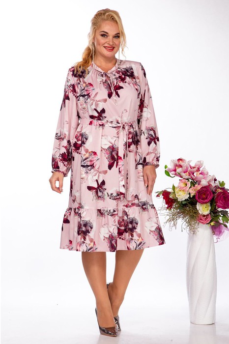 Платье женское выполнено из плательной струющейся ткани, свободного кроя, с плечевыми накладками, по горловине стойка, по низу пришит волан на сборке, платье можно носить как с поясом так и без пояса, Длина рукава 59 см, длина издеоия 105 см.