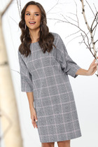 Платье с отрезной кокеткой и бантовыми складками по переду. Длина изделия 46,48р.-101 см, 50р.-103 см, 52,54-105 см. Рукав втачной длиной 48 см. Вырез горловины круглый. Застежка на потайную тесьму-молнию в боковм шве.