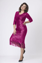 Платье женское прилегающего силуэта, расклешенное к низу. По переду платья нагрудные складки, воротник пиджачного типа, застежка с имитацией запаха. С переди по талии отдельная фигурная баска с клапаном. Спинка со средним швом и талиевыми вытачками. Рукав одношовный 7/8. Юбка притачная по талии полусолнце. В боковом шве платья застежка на потайную тесьму-молнию.