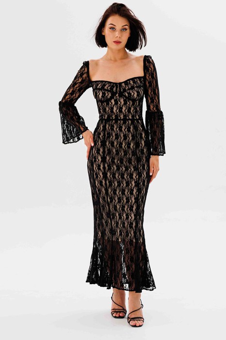 Платье в длине макси, выполнено из эластичного гипюра, обработано трикотажной эластичной подкладкой телесного цвета. Лиф отрезной по т линии талии. Обработаны чашки. Верх рукава собран на резинку. Рукав прямой до линии локтевого сгиба, имеет притачную деталь в форме клеша. Застежка - потаная молния в боковом шве.
