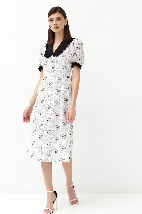 Романтичное платье полуприлегающего силуэта из креп-шифона. Модель отрезная, линии талии слегка завышена. Перед дополнен декоративной планкой с пуговицами и широким отложным воротником с рюшей.