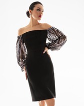 Платье прилегающего силуэта длиной ниже колена с сильным клешением книзу по форме квадрата. Рукав покроя реглан стандартное длины. Вырез горловины круглый с воротником стойкой. На спинке расположен декоративный вырез в форме капли.