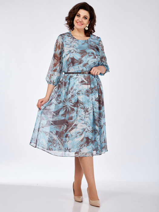 Нарядно-повседневное женское платье на подкладке, отрезное по линии талии на резинке. Лиф и юбка платья свободного покроя. Рукава втачные, по низу на резинках. Застежка по спинке на навесную петлю и пуговицу. Пояс съемный (фурнитура может меняться).