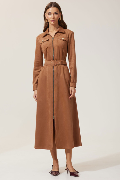 Платье полуприлегающего силуэта из замши (имитация замши). Воротник стояче-отложной, по центру застежка на декоративную молнию. Рукав втачной, по низу манжета с застежкой на петлю и пуговицу. Платье отрезное по линии талии. По переду накладные карманы с клапанами и пуговицами, на уровне линии талии шлевки для ремня. В нижней части переда функциональные карманы. По переду лифа талиевые вытачки. На спинке кокетка, рельефы и вытачки. В комплект входит ремень из основной ткани. Обращаем ваше внимание, что фурнитура может незначительно отличаться от фото.