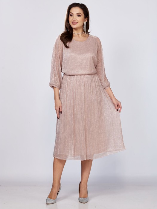 Платье женское праздничное приталенного силуэта выполнено из плиссированной ткани. Горловина изделия округой формы, на обтачке, с отрезным лифом по линии талии, на резинке, скрывающее живот и другие недостатки. По линии плеча выполнены кокетки из основной ткани и декорированы бусинами. Втачной рукав напоминающий фонарик, низ на манжете. Спинка идентична полочке, все платья на трикотажной подкладке. Его высокий класс и стиль подчеркнут красоту каждой женщины. Легкое и воздушное, это платье создано для особых случаев.
