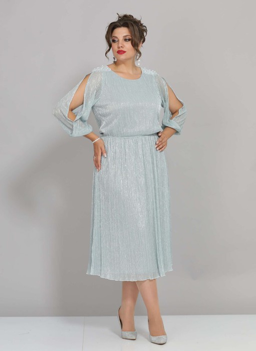 Платье женское праздничное приталенного силуэта выполнено из плиссированной ткани. Горловина изделия округой формы, на обтачке, с отрезным лифом по линии талии, на резинке, скрывающее живот и другие недостатки. По линии плеча выполнены кокетки из основной ткани и декорированы бусинами. Втачной рукав напоминающий фонарик с разрезами по середине, низ на манжете. Спинка идентична полочке, все платья на трикотажной подкладке. Его высокий класс и стиль подчеркнут красоту каждой женщины. Легкое и воздушное, это платье создано для особых случаев.