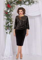 Нарядное платье, выполненное из плательной ткани с легким блеском (тянется). По переду ассиметричный отрезной пояс с отделочным кантом. Верхняя часть переда с рельефными швами. По нижней части переда – баска, переходящая в волан. Спинка со средним швом, талиевыми вытачками и бантовой складкой по нижней части. Застежка на потайную тесьму-молнию в среднем шве спинки. Горловина округлой формы. Рукава втачные, одношовные с разрезами по низу.