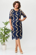 Платье женское из костюмно-плательной ткани, прилегающего силуэта, расширенное к низу «гаде».  Длина посередине спинки 141 см. Перёд с фигурной кокеткой из гипюра, отрезной по линии талии, с рельефными швами от кокетки до шва на линии талии справа и от кокетки до низа с лева. По низу левого рельефного шва обработан разрез. Спина со средним швом, с кокетками из гипюра, с талевыми вытачками. Горловина переда и спины, кокетки спины по средним срезам окантованы основной тканью. По середине горловины спины выполнена застежка на навесную петлю и пуговицу. Рукава втачные, одношовные, из гипюра оформленные по низу фестонами, длиной 32,0 см. Горловина переда и спины округлая, углублённая. В левом боковом шве обработана застёжка на потайную тесьму-«молнию». Изделие на подкладке.