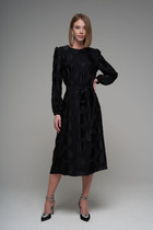 Стильное платье длиной выше колена, немного расширенное книзу. Свободное в талии и бедрах. Втачной длинный рукав, расширенный книзу. Горловина круглая. Глубокий вырез на спинке, который фиксируется завязками в  области лопаток. Платье без подкладки.