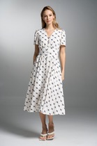 Классическое платье из льняного полотна, отрезное по талии, с боковыми карманами, по нижней части заложены складки застежка-молния. Нижняя часть платья с центральной застёжкой на петли и пуговицы. Верх и них платья декорированы дизайнерской вышивкой.