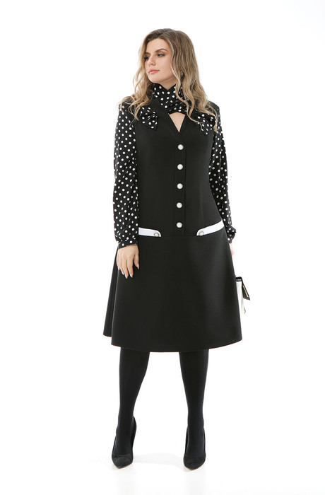 Платье имеет горизонтальный подрез ниже линии бедер, который декорирован узкими втачными деталями. Нижняя часть платья расширенного к низу силуэта. Застежка центральная бортовая с планкой на петли пуговицы. Планка переходит в воротник. Вырез горловины V-образный. Рукава втачные, выполненные из отделочной ткани. По низу рукавов узкие манжеты с застежкой на петли и пуговицы. На рукаве по линии притачивания манжеты есть сборка. Также из отделочной ткани выполнен съемный шарф, который драпируется вокруг шеи и фиксируется с помощью небольших заработанных отверстий в швах притачивания планки к деталям переда. Длина рукава 64 см. Длина изделия по спинке 109 см.