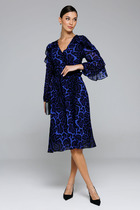 Платье из шифона на трикотажной подкладке, Х-образного силуэта с полуприлегающим лифом. Платье отрезное по линии талии. По переду лифа расположены рельефы, по спинке лифа талиевые выточки. Юбка расклешенная из шести клиньев со встречными складками по линии талии. В среднем шве спинки предусмотрена потайная тесьма- молния. Рукав втачной покроя тюльпан, длина рукава 15 см.