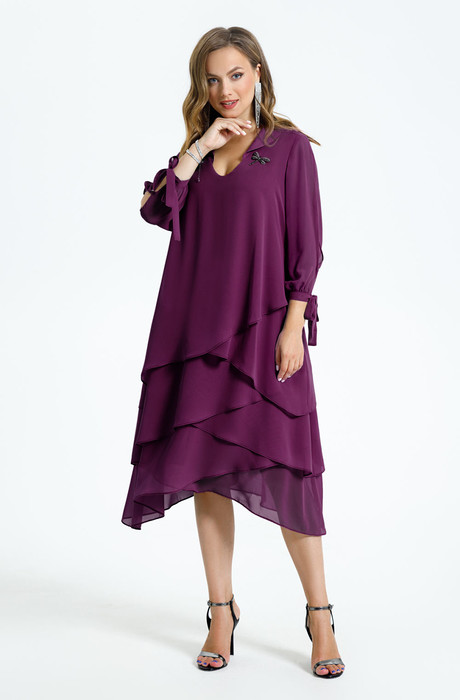 Трехъярусное платье из легкой струящейся ткани A-силуэта длиной миди. Рукав втачной, длиной 5/6, с фигурными отверстиями сбоку и с манжетой переходящей в бант. Вырез горловины v-образный. Платье на подкладке.