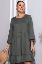 Нарядное платье трапециевидного силуэта с рукавом реглан. Рукав прямой, низ на резинке. Низ платья оформлен рюшей из плиссированной ткани. Вырез горловины круглый с заложенными вокруг нее складками, декорирован завязывающимся бантом и пришивными стразами. Платье выполнено на подкладке.