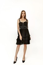 Эффектное платье прилегающего силуэта из трикотажного полотна с пайетками. V-образынй вырез изделия обработан внутренней обтачкой. Платье отрезное по линии талии, по переду изделия - разрез. Длина изделия по спинке от плечевого шва до низа изделия — см. Рост фотомодели — 170 см.