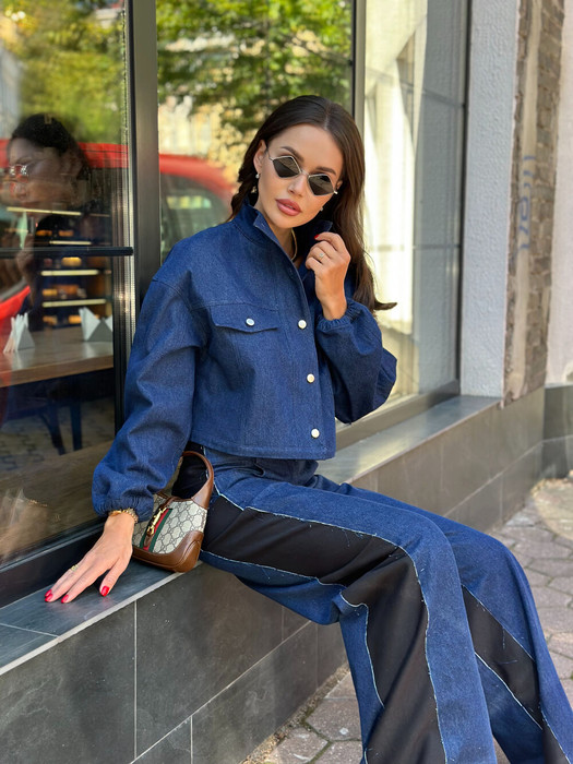рубашка из плотого денима, ворот высокий, застёжка на пуговицы. Пойкрой свободный. По передним половинкам обработаны клапаны