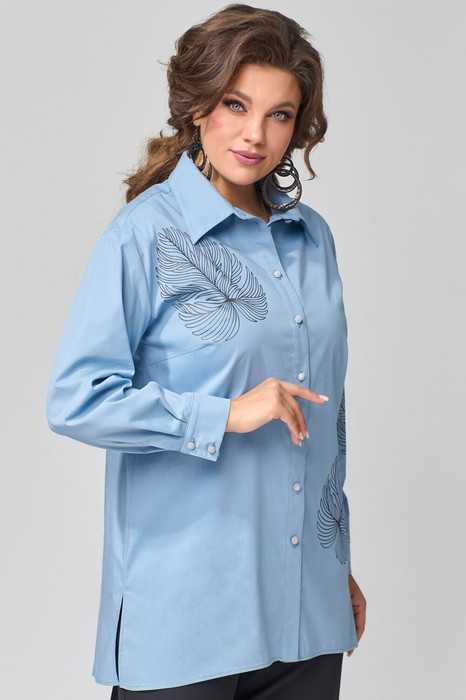 Блуза "Радаси" из хлопокой ткани, прямого силуэта. Рукав втачной, длина рукава не регулируется, манжет на застежку, на петли пуговицы. Воротник рубашечного типа со стойкой, край борта обработан отрезной планкой. Блузу украшает декоративная печать. Внимание! Украшение в комплект не входит.