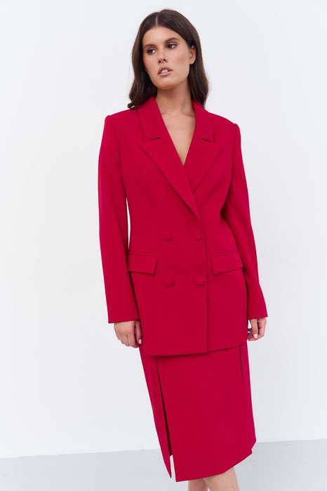 -выполнена из костюмной ткани в красном цвете, юбка на подкладке, застежка-молния по заднему полотнищу юбки, верх юбки обработан поясом-обтачкой. Длина юбки 75 см.