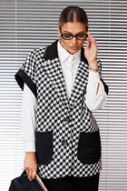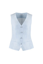 Жилет из натуральной ткани полуприлегающего силуэта С V-образным вырезом и центральной застежкой на пуговицы. Перед с отрезными бочками и имитацией карманов с листочками. Спинка со средним швом, отрезными бочками и хлястиком по центральной части спинки. Низ фигурный. Жилет на хлопковой подкладке.