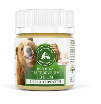 Изготовлена по рецептам кавказских целителей. Применяется при простуде, для облегчения дыхания. Медвежий жир и компоненты растирки восстанавливает работу бронхов, ослабляют кашель, могут устранить воспаление, уничтожить вредные бактерии и вирусы, оказать отхаркивающее воздействие.