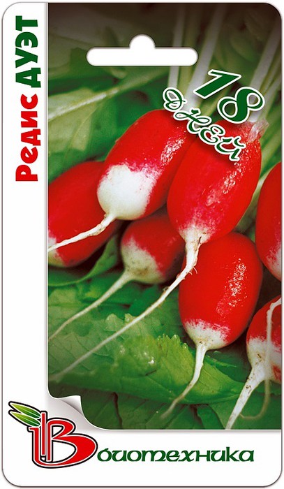 Ультраранний новейший сорт редиса.; Корнеплод красного цвета с белым основанием, средней величины удлиненно-цилиндрической формы. Очень сочный, имеет великолепный товарный вид. Устойчив к цветушности. Не одревесневает, не растрескивается. Вегетационный период составляет 18-25 дней. Для открытого и защищенного грунта. Посев: апрель-октябрь