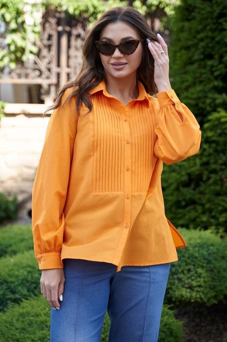 Блузка женская прямого силуэта.  Перед со вставкой с вертикальными защипами. Спинка с кокеткой. Рукав втачной одношовный со сборкой по низу, на притачном манжете. Воротник на стойке.