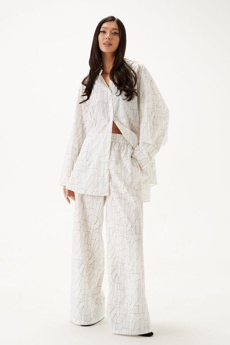 Рубашка свободного кроя выполнена из хлопкового полотна белого цвета с геометрическим принтом. Характеристики: рубашка прямого свободного кроя, горловина стойка. Застежка центральная на петли пуговицы, рукав акцентный объёмный, крой рукава летучая мышь , спинка отрезная с декоративной сборкой. Длина по спинке 80 см, длина рукава от горловины 74 см.