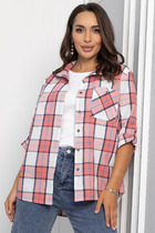 Рубашка прямого кроя выполнена из ткани цвета капучино с принтом белая вертикальная полоска. Характеристики: прямой свободный крой, отложной воротник, застежка центральная на петли пуговицы, по переду крупные накладные карманы с клапаном, рукав спущен, по низу рукава широкая манжета. Длина по спинке 70 см, длина рукава 82 от края горловины.