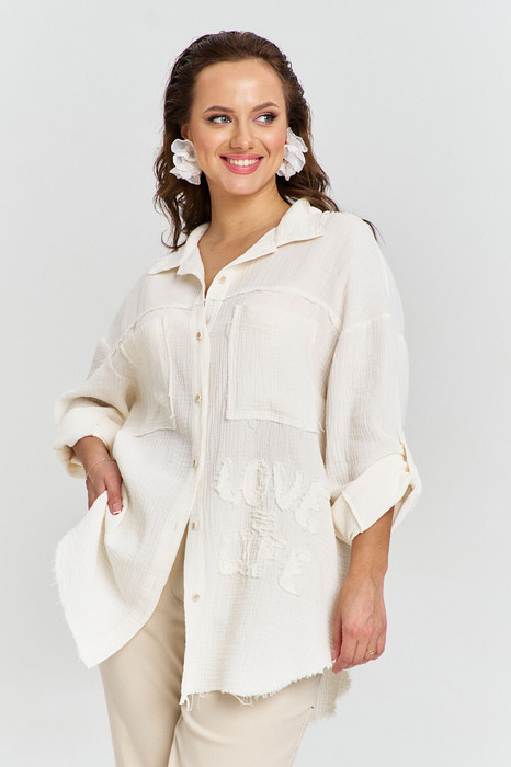 Рубашка из мягчайшего хлопкового муслина, свободного силуэта, застежкой спереди на пуговицы, длинным рукавом и рубашечным воротником. Перед с отрезной кокеткой, накладными карманами и авторскойвышивкой. Спинка с кокеткой и складкой. Рукава с манжетами, длина регулируется хлястиком. Некоторые швы необработаны, что при энзимной стирке придает изделию стильную винтажность.