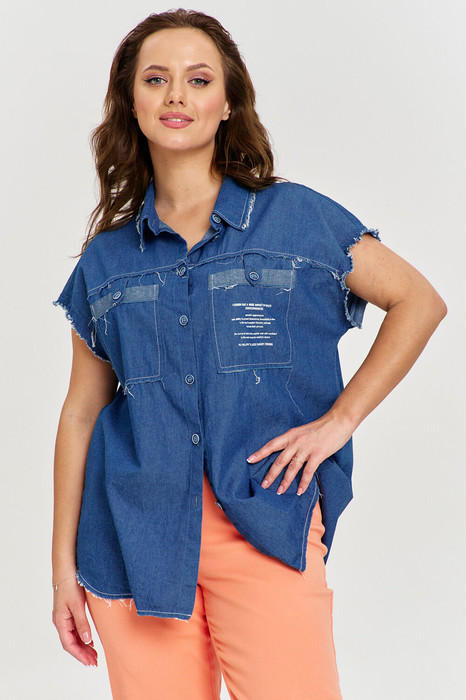 Рубашка из тонкого хлопкового джинса, свободного силуэта, удлиненной спинкой, застежкой на пуговицы спереди и рубашечным воротником. Спинка с отрезной кокеткой и бантовой складкой. Рукав короткий, цельнокроеный. На переде отрезные кокетки и накладные карманы с авторским принтом. Некоторые швы изделия необработаны, при энзимной стирке обретают стильную вытрепанность.