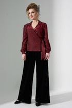 Блузка женская свободного покроя, удлиненная, с рубашечным рукавом на манжете по низу, по переду на уровне груди - накладной карман, застежка спереди на планку с пуговицами, воротник рубашечный на стойке, низ изделия фигурный, с закругленными разрезами по боковым швам.