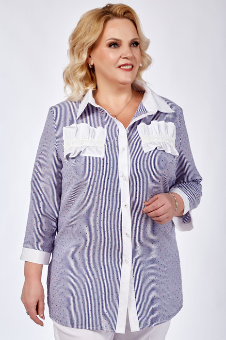 Рубашка женская полуприлегающего силуэта, рукав втачной 3/4 с притачным манжетом, застежка центрально-бортовая  на петли и пуговицы, в боковых швах разрезы. Манжет, планка, воротник, декоративная деталь выполнены из контрастной ткани.