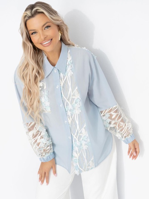Рубашка ЧАРУТТИ буквально как глоток свежего воздуха в марафоне ежедневных забот. Заботливое напоминание о том, что в каждом дне есть место для себя. Балуйте себя, на вас все держится, вы должны быть в ресурсе. Рубашка классического кроя. Удлиненная, хорошо смотрится в заправленном виде и навыпуск. Акцентная ткань с объемными цветами. Карман на передней стороне изделия. Рукава оформлены скрытой резинкой.
