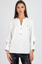 Блуза свободного покроя из хлопковой ткани. Горловина оформлена воротником рубашечного типа. Застежка - планка с петлями и пуговицами. На спинке - кокетка с планкой и закрепками. Рукава - втачные со спущенной линией плеча, снизу - манжеты с застежкой на петли с пуговицами и кулисой по рукаву. По переду с одной стороны обработан накладной карман. В комплект входит съемный галстук.