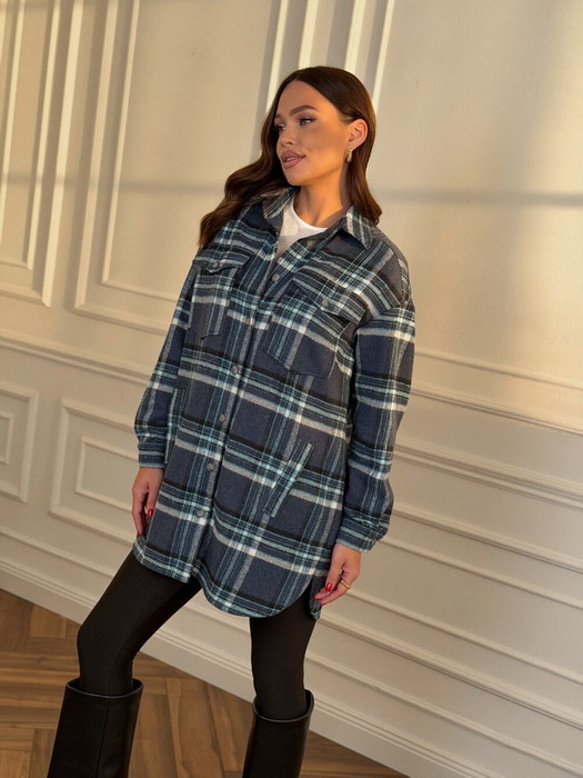 Рубашка женская, прямого свободного силуэта, со спущенной линией плечевого шва. Рубашка длинной ниже линии бедер. Спинка с отрезной кокеткой и двумя односторонними складками на нижней детали. Перед с нагрудными вытачками из бокового шва, застежкой-цельнокроенная планка на 7 петель-пуговиц. По переду настрочены нагрудные накладные карманы с клапаном, а также обработаны карманы с листочкой, концы настрочные.  Низ  рубашки фигурной формы с разрезами по бокам. Рукава втачные, двух шовные, с разрезом по верхнему шву. Низ на притачной манжете, застегивается на пуговицу. Воротник стояче-отложной на отрезной стойке.