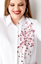 Блузка выполнена из блузочной ткани. Блузка прямого силуэта, длиной до линии бедер. Застежка спереди на пуговицы на потайной планке. На спинке кокетка и встречная складка. Воротник стояче-отложной с отрезной стойкой. Плечевой шов спущен. Рукав рубашечного покроя, одношовный. Низ рукава на манжете, застегивающейся на пуговицу. Низ блузки фигурной формы, с разрезами в боковых швах.