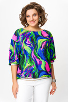 Блузка выполнена из костюмной ткани с анималистичным принтом . Блузка прямого силуэта, длиной ниже линии бедер. Спереди центральная застежка на пуговицы. Спинка цельная. Воротник стояче-отложной. Плечевой шов удлинен. Рукав рубашечного покроя, одношовный с прорезью и складкой по низу. Низ рукава на притачной манжете, застегивающийся на пуговицы. Низ блузки фигурной формы. Спинка декорирована нашивкой из эко-кожи.