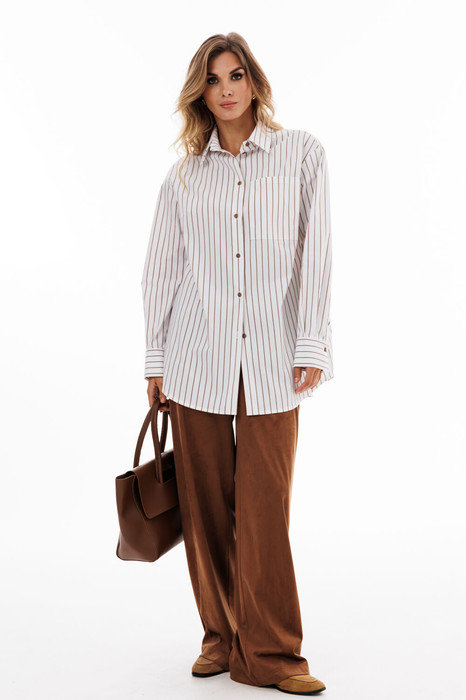 Блузка выполнена из блузочной ткани в полоску. Блузка прямого силуэта, длиной ниже линии бедер. Спереди застежка на пуговицы. На спинке обработана кокетка и две складки. Воротник стояче-отложной. Плечевой шов удлинен. Рукав рубашечного покроя, одношовный, низ рукава на притачной манжете. Низ блузки фигурной формы. По спинке блузка декорирована брендированной нашивкой из натуральной кожи.