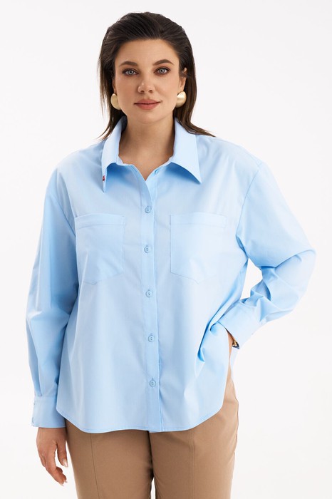 Базовая рубашка. Линия плеча спущена. Рукав длинный на манжете. По переду накладные карманы и застежка на петлю пуговицу. На воротнике пришит декоративный элемент в виде губ. Низ изделия фигурный.