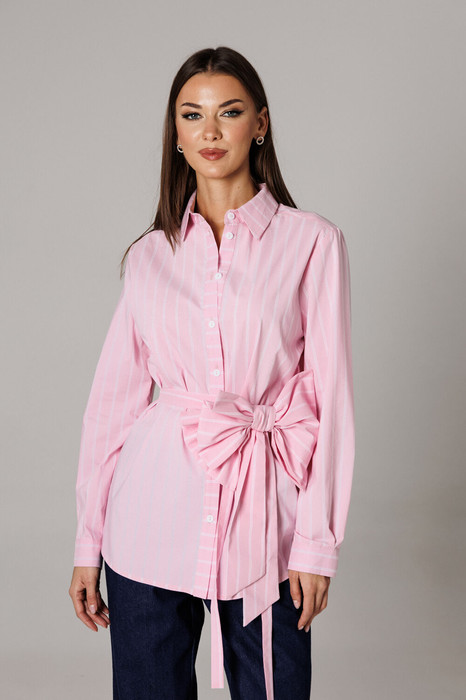 Спинка изделия состоит из горизонтальной кокетки и основной детали, на которой расположены две складки для свободы движения. Линия низа: фигурная. Рукав втачной, одношовный, с притачной манжетой, высотой 5,5 см и разрезом-планкой для петли/пуговицы. Высота планки 11 см. Длина рукава в готовом виде 61 см. Горловина оформлена стойкой с рубашечным воротником. Застежка вертикальная на планках петли/пуговицы. Длина блузы по спинке 74-76 см (в зависимости от размерного ряда). В комплекте присутствуют съемные текстильные дополнения: пояс и декоративная брошь в виде банта. (фурнитура может отличаться от представленной на рекламном фотоматериале)