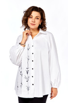 Рубашка «оверсайз», с отложным рубашечным воротником на стойке, застежка центральная на петли и пуговицы. По переду от плечевого шва рельефы. По низу рубашки в рельефных швах разрезы. Спинка с отрезной кокеткой и встречной складкой. Рукав со спущенной линией плеча, с декоративной патой на петлю и пуговицу.