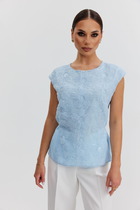 Рубашка свободного кроя без вытачек с накладными карманами. Воротник рубашечного типа с отрезной стойкой и застёжкой на петли и пуговицы по планке. Модель привлекает внимание различным направлением полос на деталях переда. Рукава втачные одношовные.