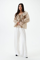 Блуза свободного кроя, укороченная, из хлопковой ткани. Воротник рубашечного типа с отрезной стойкой. По переду отрезная кокетка с отделочной тесьмой из бусин. Центральная застежка на пуговицы. Рукав спущенный на манжете с застежкой на пуговицу.