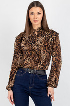 Блуза женская, прямого силуэта с потайной застежкой. Перед с нагрудными вытачками. Спинка с отрезной  кокеткой. Воротник рубашечного типа, с отрезной стойкой. Рукав тачной, одношовный, с манжетой по низу. Низ фигурный. Декоративный цветок (съемный, пуговица)