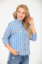 Стильная рубашка свободного кроя с цельнокроеной кокеткой полочки и спинки, со спущенной линией плеча. Модель прямого силуэта, c рубашечным воротником и длинным рукавом на манжете. На левой полочке обработана вставка с поперечным рисунком из отделочной ткани. Линия низа имеет асимметричную форму, спинка длиннее, чем полочка. Низ изделия обработан окантовкой . По спинке заложена и застрочена бантовая складка. По переду блузы планка на пуговицах.