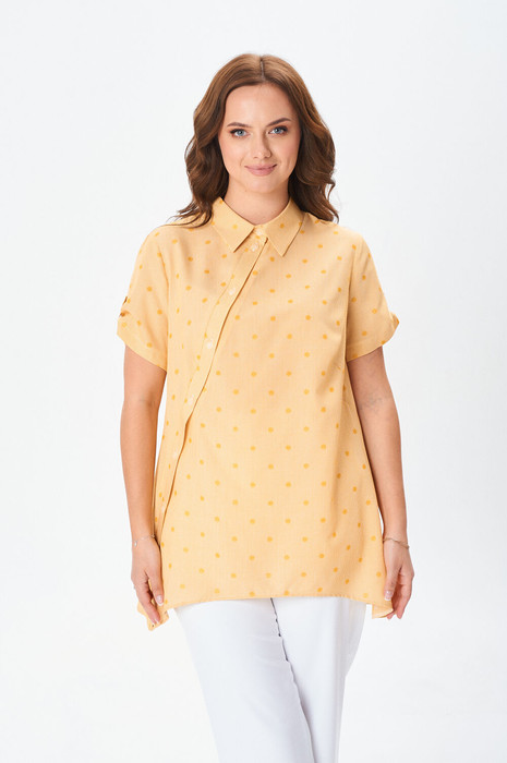 Стильная рубашка свободного кроя с ассиметричной центральной планкой на застежку петли-пуговицы.  Рукав короткий. Спинка изделия с кокеткой и складкой. Низ изделия фигурный.